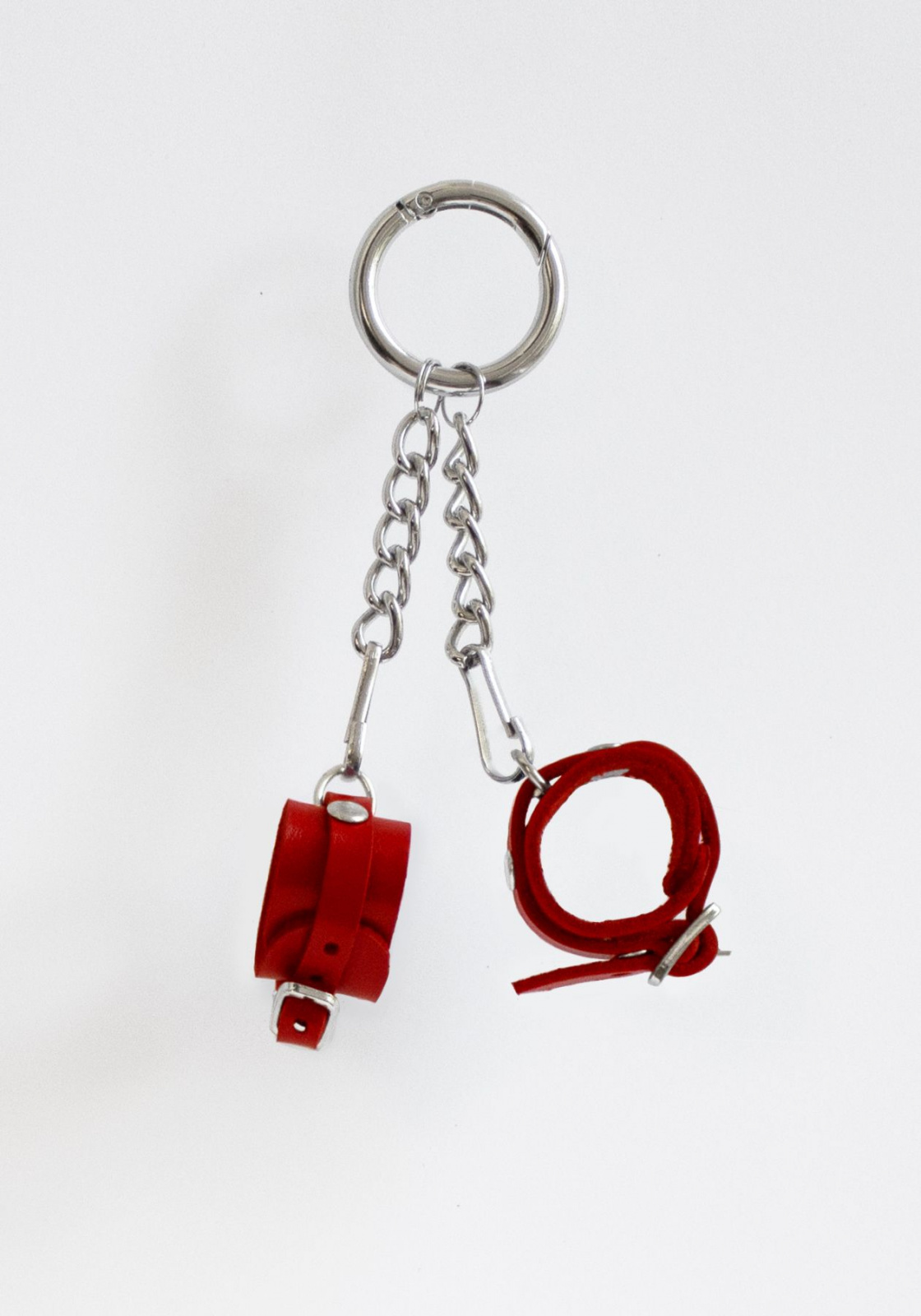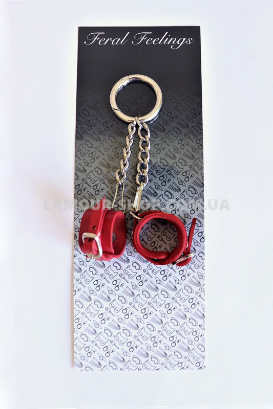 Мініатюрна версія наручників виготовлена із натуральної шкіри рослинного дублення. Кожен наручник кріпиться до основного кільця-карабіна ланцюжком і міні-карабіном, тому можна носити лише один наручник, а другий подарувати своєму партнеру як символ.