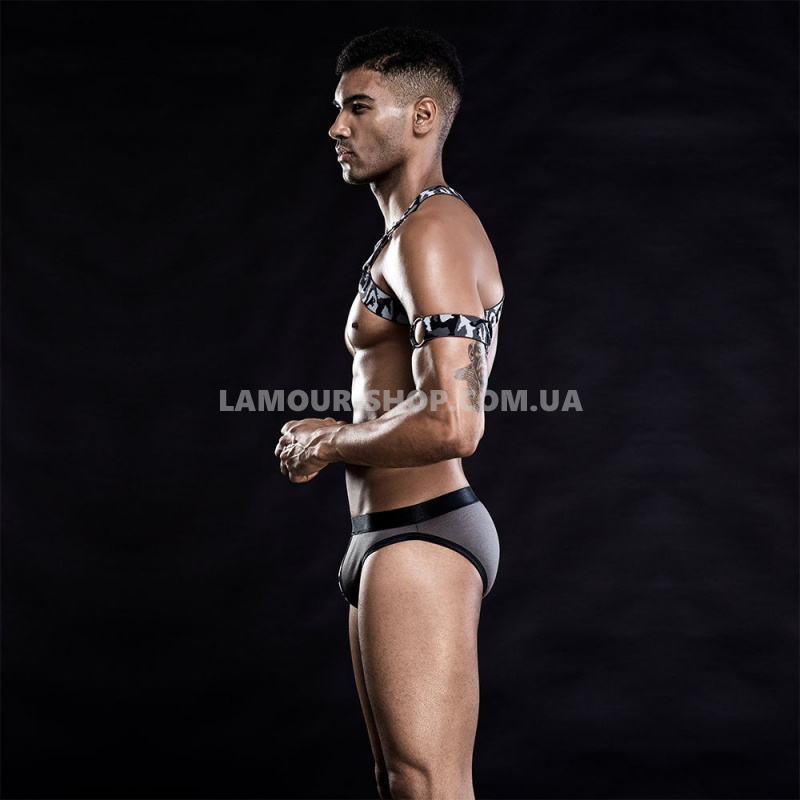 Класичні труси-плавки облягають тіло, наголошуючи на розмірах твого бійця за рахунок вертикальної вставки. Додаткова портупея на груди та біцепси створює потужний образ суворого сексуального воїна, який може практично все.