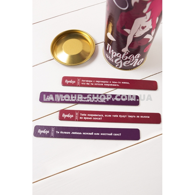 Все задания делятся на 2 типа: “правда” или “дело”. “Правда” - это откровенный вопрос, на который вам или вашему партнеру нужно ответить честно. Вам интересно, как ваш любимый человек относится к связыванию во время секса? Какую эротическую фантазию он или она хочет воплотить с тобой? Возможно, узнав ответ на эти интересные вопросы, вы сможете очень скоро опробовать их на практике, когда дело дойдет до “Дела”.