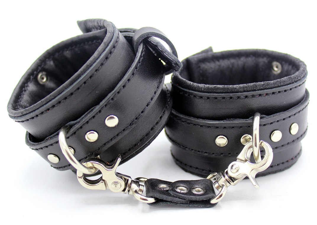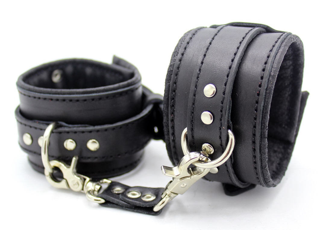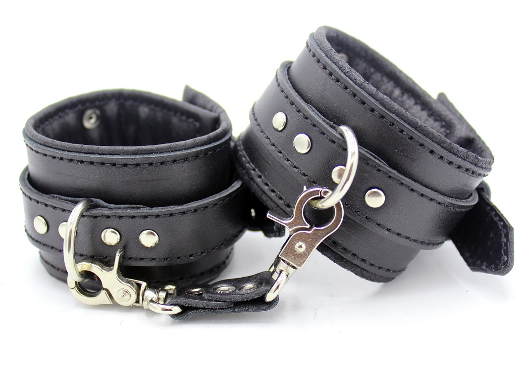 Наручники з натуральної шкіри - універсальний аксесуар для постільних ігор в стилі БДСМ. Зафіксуйте руки партнера, щоб надати своїй фантазії повний карт-бланш. Розмір наручників регулюється в залежності від вашої комплекції: це легко зробити за допомогою спеціальних ремінців, а карабіни дозволяють зводити руки разом, або розводити в сторони.