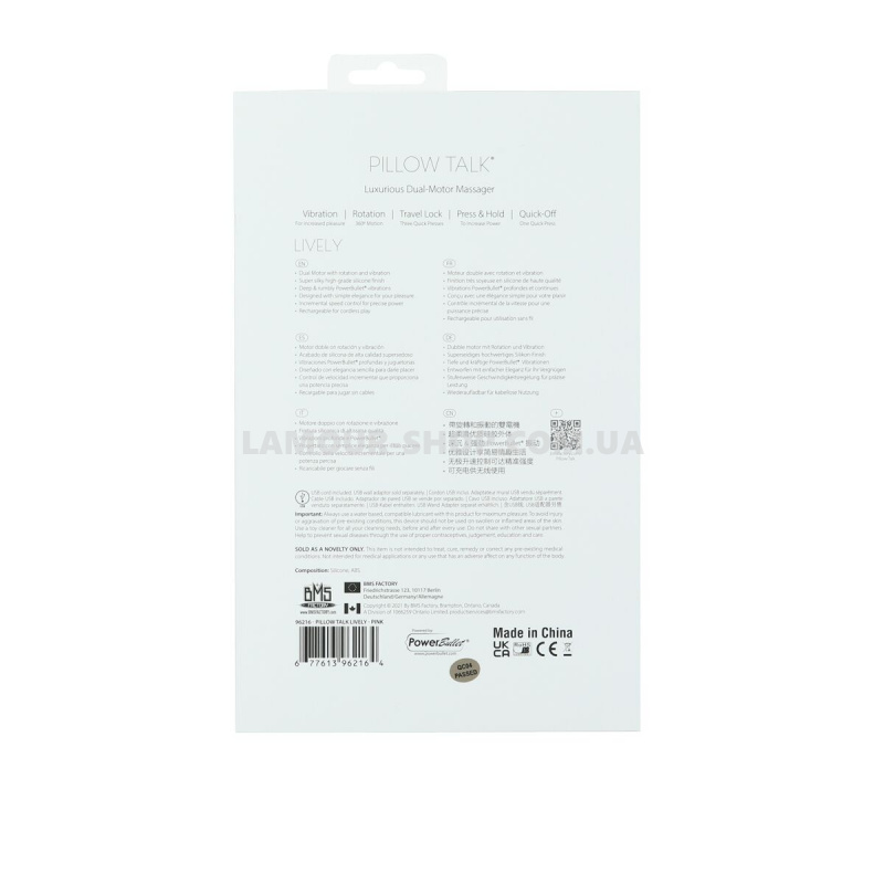 Розкішний кролик з ротацією та вібрацією Pillow Talk Lively виготовлений із абсолютно безпечних високоякісних матеріалів. Зверніть увагу: кролик не є водонепроникним, тому використовуйте для очищення спеціальні засоби.