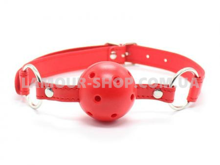 Кляп на ремінці з прес-шкіри, об'єм регулюється, має металеві кільця з боків, пластикова куля в дірки, що дає можливість слині стікати.