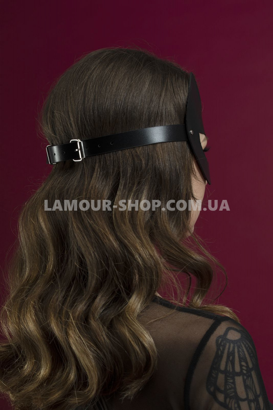 Невелика акуратна маска кішки з маленькими вушками та сріблястою фурнітурою: заклепками та пряжкою. Маска стильно виглядає і м'яко адаптується до обличчя будь-якої форми. Виготовлена із високоякісної шкіри рослинного дублення.