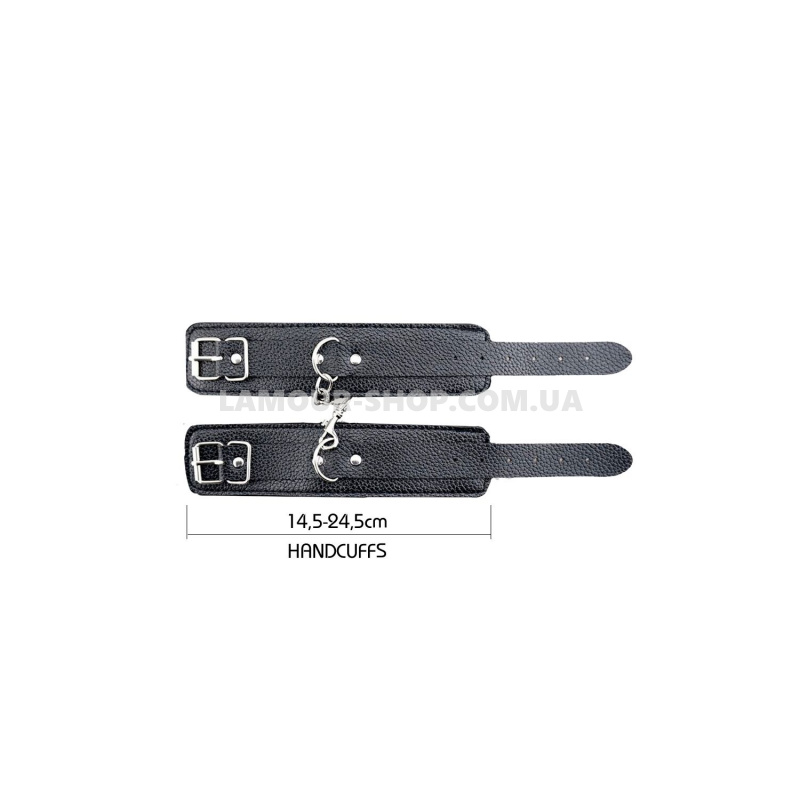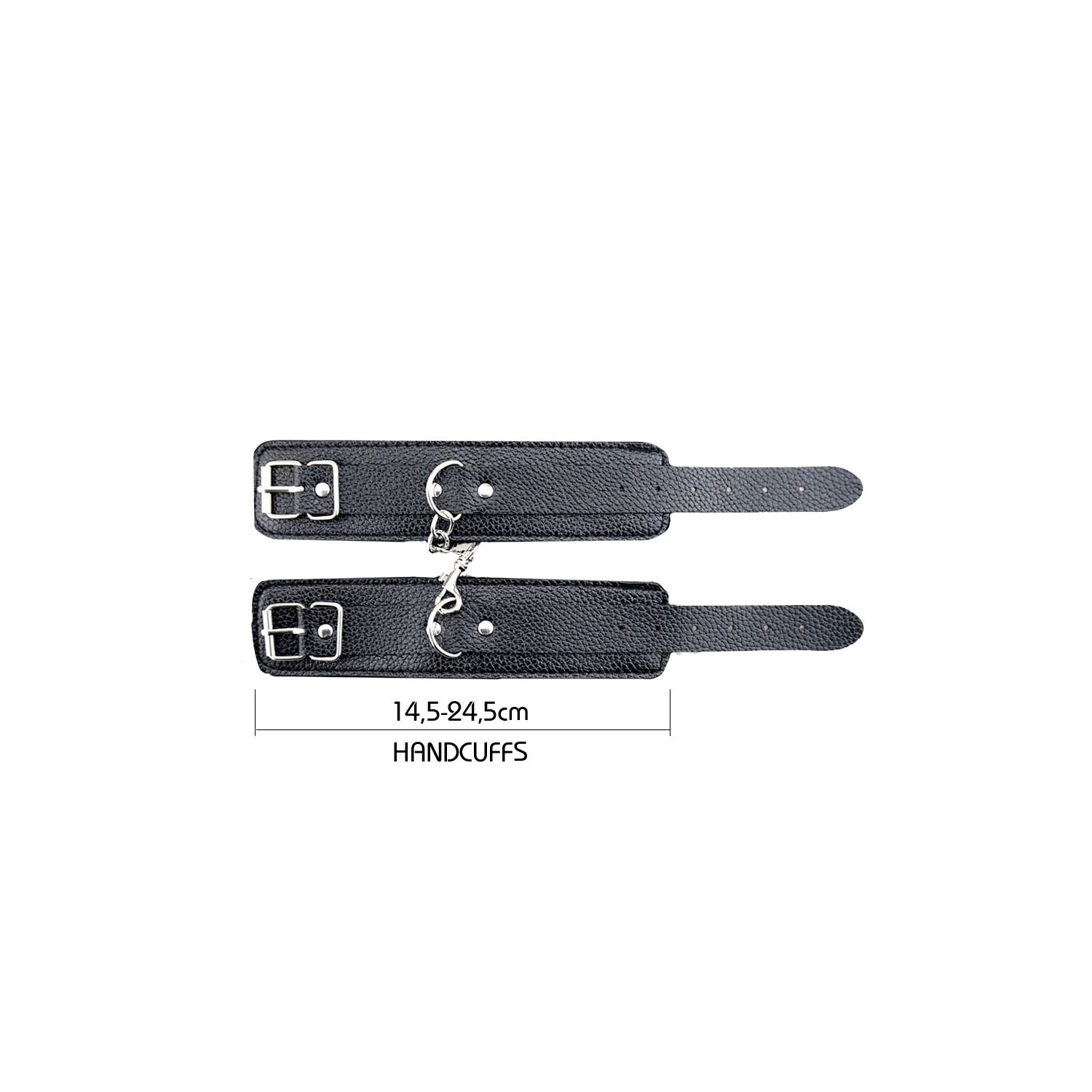 Наручники на ланцюжку із карабіном. М'які широкі наручники зі шкірозамінника, які регулюються за обсягом - чудовий спосіб фіксації! Між собою з'єднані ланцюжком, що знімається. Фіксуйте руки між собою, на ліжку або в будь-якому іншому місці! Ширина наручників 5 див, довжина регулюється від 14,5 до 24,5 див.