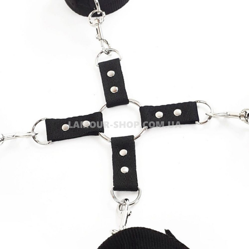 Розташуйте партнера на животі, заклавши руки за спину і зігнувши ноги в колінах. Пристебніть усі частини бондажу до кільця та насолоджуйтесь абсолютним доступом до тіла, і неможливістю другої половинки рухатися та чинити опір.