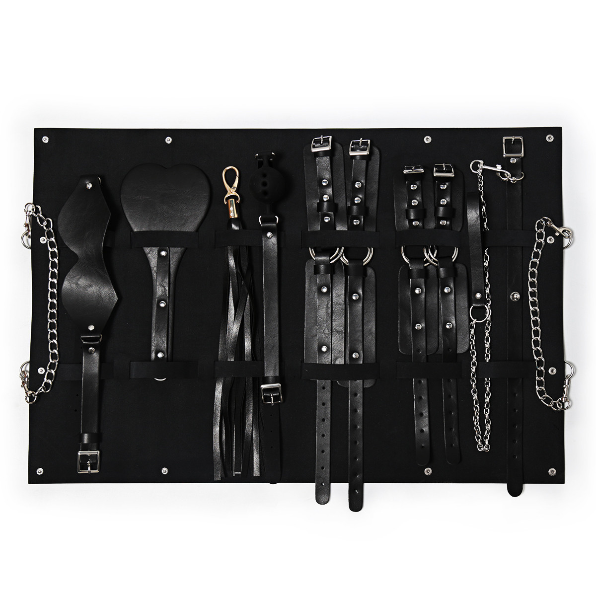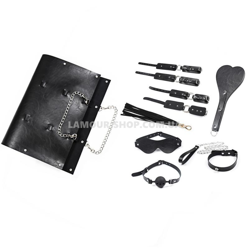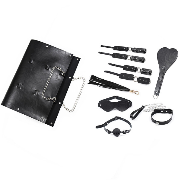 До набору входять: наручники, поножі, падл, ошийник з повідцем, маска, кляп, батіг, а також сумка для зберігання.