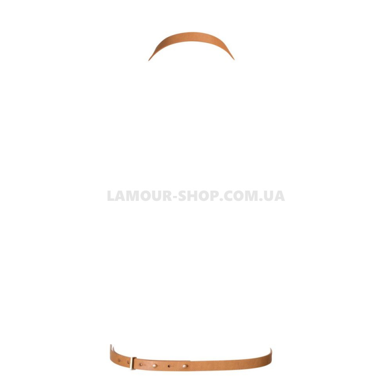 Данная модель портупеи сочетает в себе сексуальность и лаконичность, легкий флер БДСМ и выверенную стильность. Чокер соблазнительно охватывает шею, а ремни подчеркивают женственность форм. Портупея плотная, из полиуретана, напоминающего кожу. Ремни регулируются по длине, поэтому ложатся мягко, нигде не передавливая тело.
