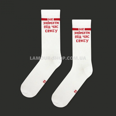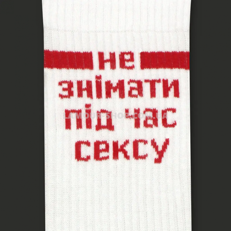 Наш бестселлер – високі білі шкарпетки з провокативним написом для розкутих і сміливих. Рекомендується не знімати під час сексу. Жіночі та чоловічі моделі.