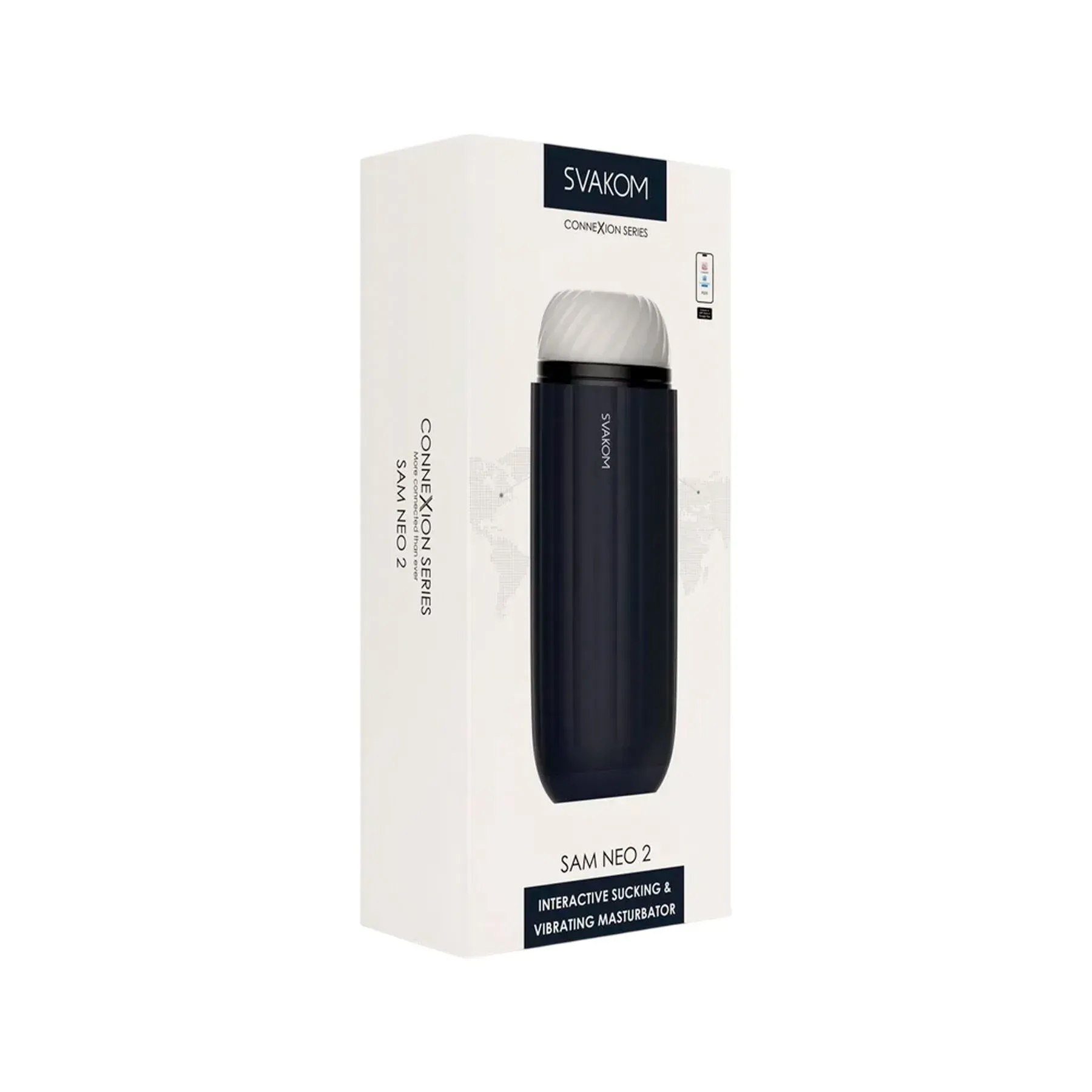Ну і, звичайно, інтерактивний смарт-мастурбатор з вібрацією та посмоктуванням Svakom Sam Neo 2 можна синхронізувати зі смартфоном для зручного керування, додаткових функцій та передачі керування на відстані. Працює з двома безкоштовними застосунками, Svakom та Feel Connect (QR-код для завантаження можна знайти в інструкції до мастурбатора, а також завантажити застосунки безпосередньо в App Store або Google Play).