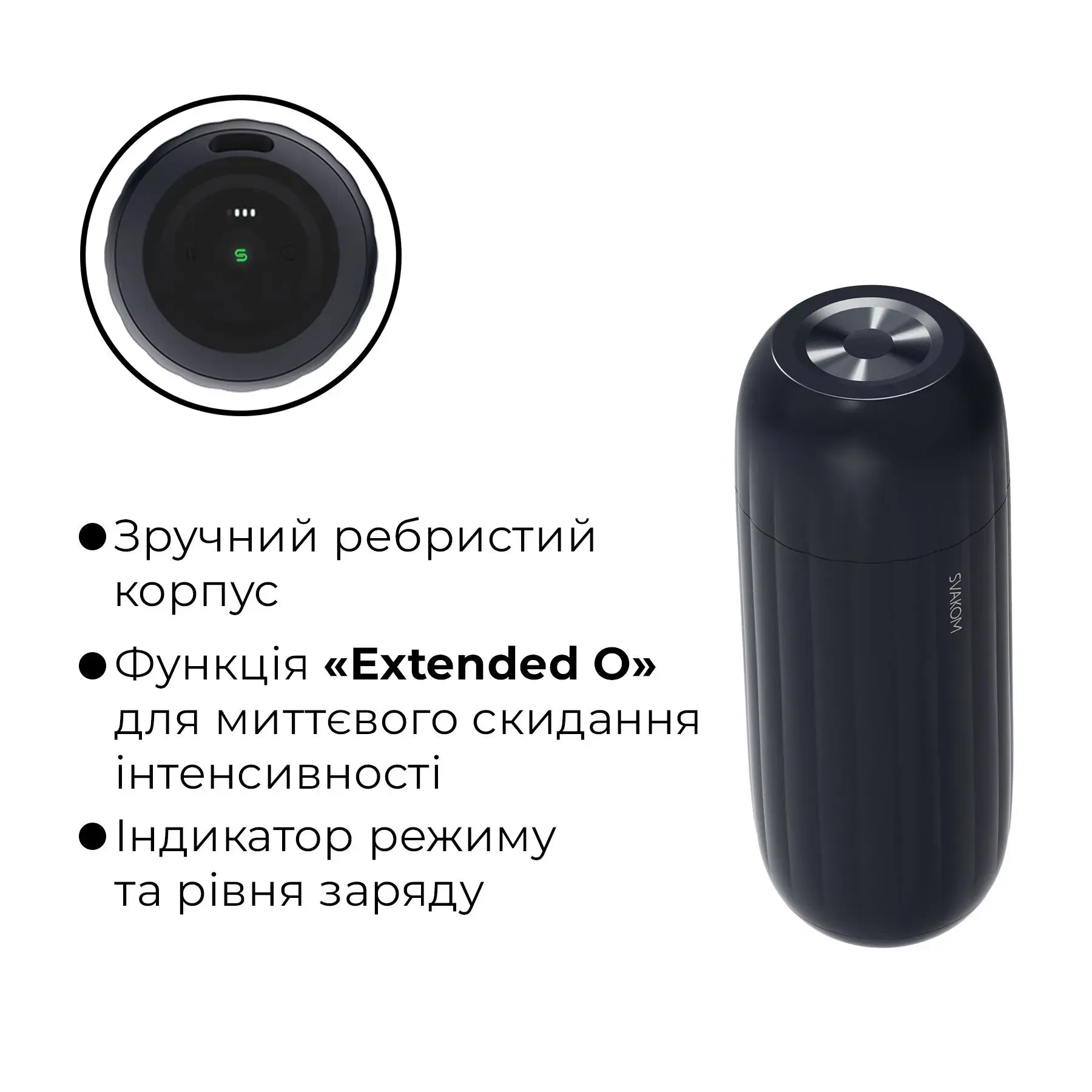 функція «Extended O» для миттєвого скидання інтенсивності вакууму та вібрації (для комбінованих режимів та режимів всмоктування), щоб вдосталь насолодитися своїм оргазмом;