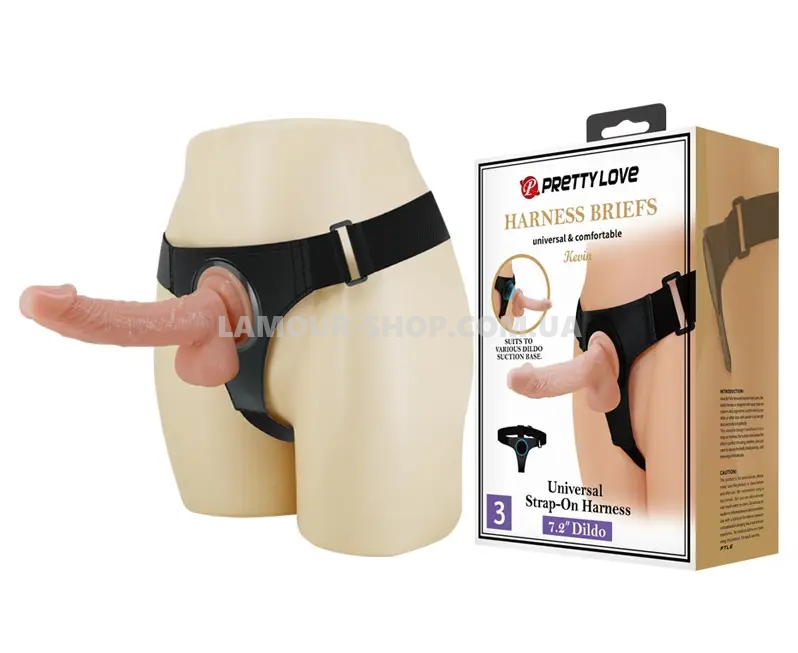 У комплекті йдуть універсальні трусики – Pretty Love Harness Briefs Bobby на ременях, для фіксації будь-яких фалоімітаторів з присоскою діаметром до 9 см.