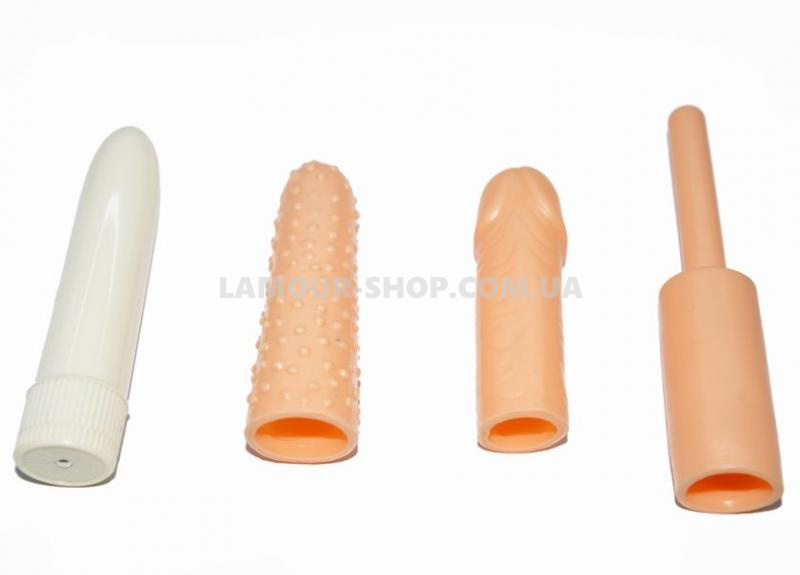 Пластиковый вибратор с плавной регулировкой вибрации, с тремя пластезолевыми насадками в комплекте.