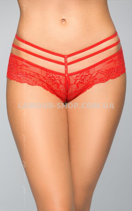 Женские трусики красного цвета. Выполнены из качественного кружевного материала. Сверху украшены поясками, декорированы стразами. В области интимной зоны сексуальный разрез.